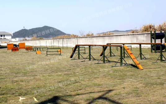 兒童國防軍事障礙單道場地長50米,寬2米。通常為雙道并列設置。項目依次為獨木橋、高欄、斜坡、地籠、矮墻、高板6個項目。  此器械提升參訓人…